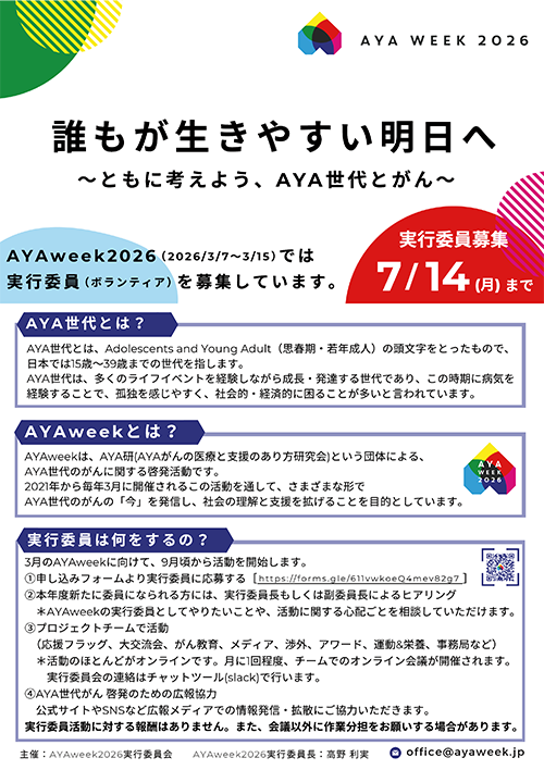 AYA研会員、非会員を問わず、ぜひともAYA weekの趣旨にご賛同いただき、ご協力を賜りたくお願い申し上げます。まずは下記にAYAweek2026の開催に向けて、実行委員を募りますので、ご参画いただけます場合には、ご入力フォームよりご返信いただければ幸いです。